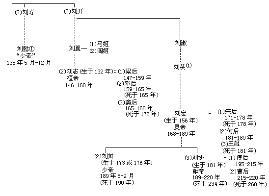 表9概括了后汉诸帝的家谱。这类内容贫乏的略图是看不清这个王朝十分典型的权力斗争、成功、失败和个人悲剧的。这些内容将在以后讨论;这里只进一步讨论一种意见。